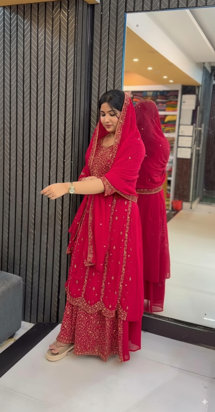 Elegant Arabic gown with intricate embroidery and delicate embellishments, designed with a flowing silhouette for a graceful look. Paired with a matching dupatta featuring fine detailing, this outfit is perfect for weddings, festive occasions, and special events. Crafted for both comfort and style, it blends traditional artistry with modern elegance.