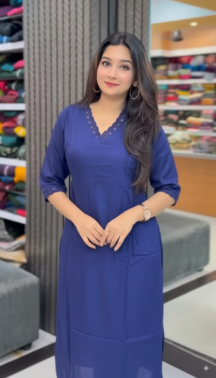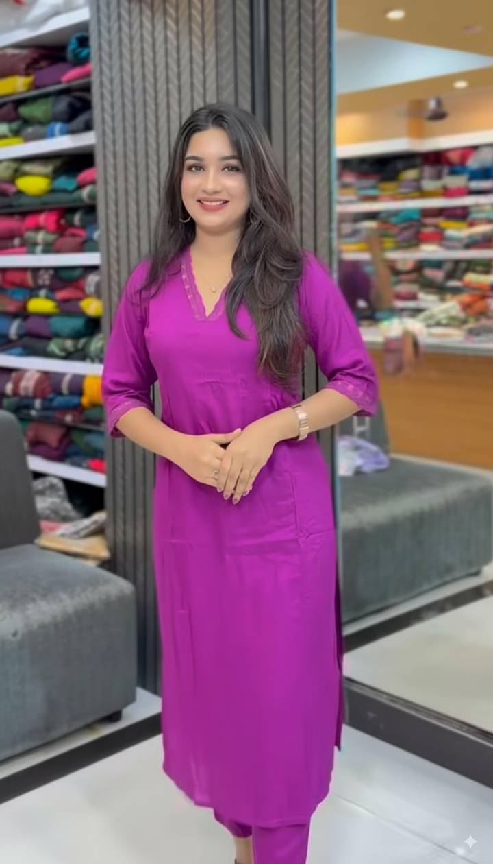 Effortless style meets everyday comfort in this trendy co-ord set. Designed with a straight-cut kurta and matching bottoms, it features subtle detailing on the sleeves and neckline for an elegant touch. Ideal for workwear, casual outings, or daily wear—this set keeps you polished all day long.