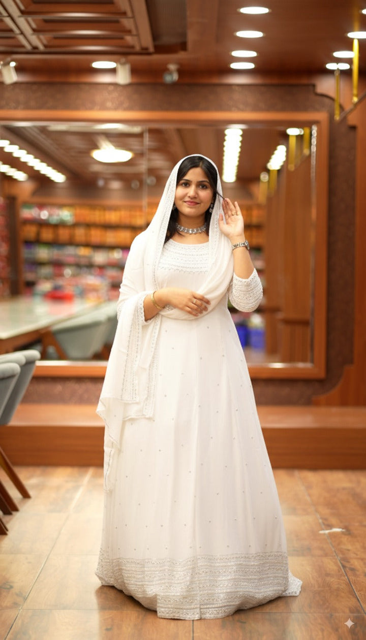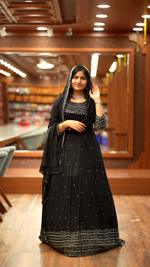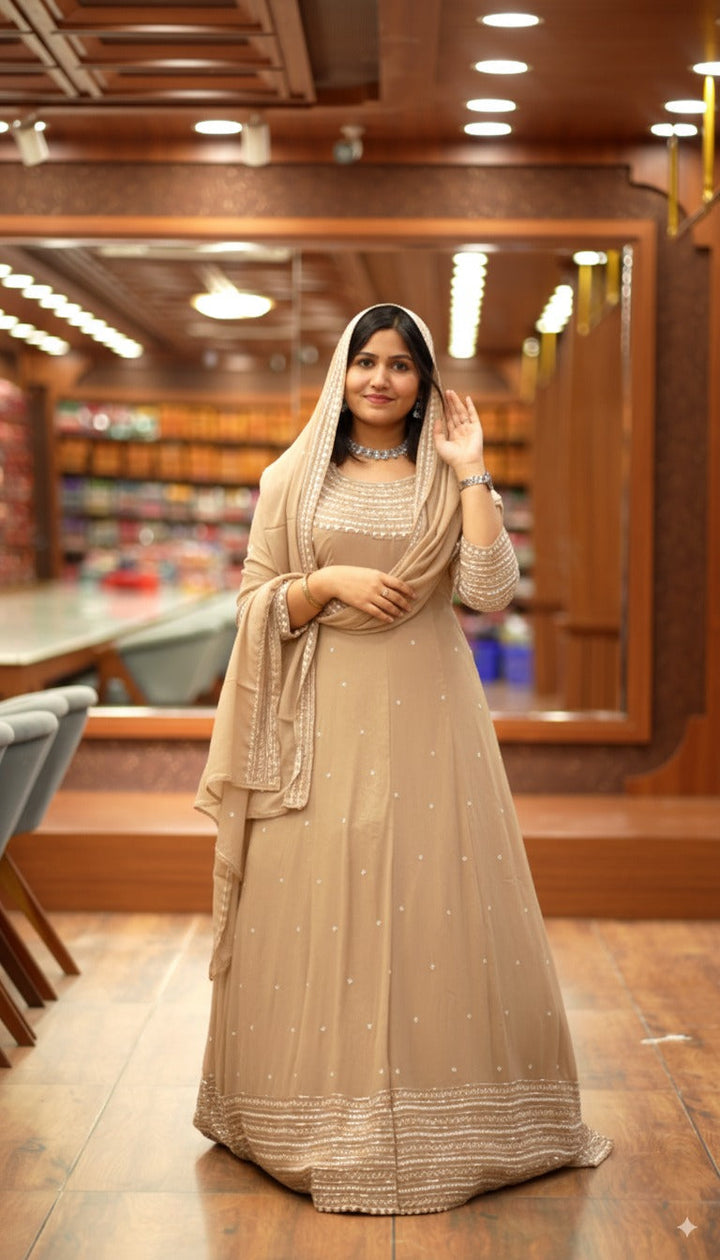 Step into timeless elegance with this designer-inspired gown, crafted to bring together luxury and tradition. Featuring intricate golden thread embroidery, delicate sequin detailing, and a graceful silhouette, this gown exudes royal charm.