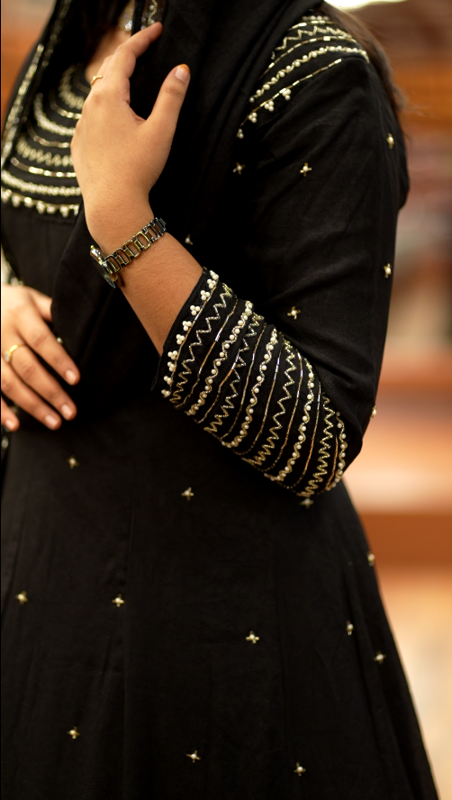 Design: Full sleeves with heavily embroidered cuffs, detailed neckline, and a finely embroidered hemline