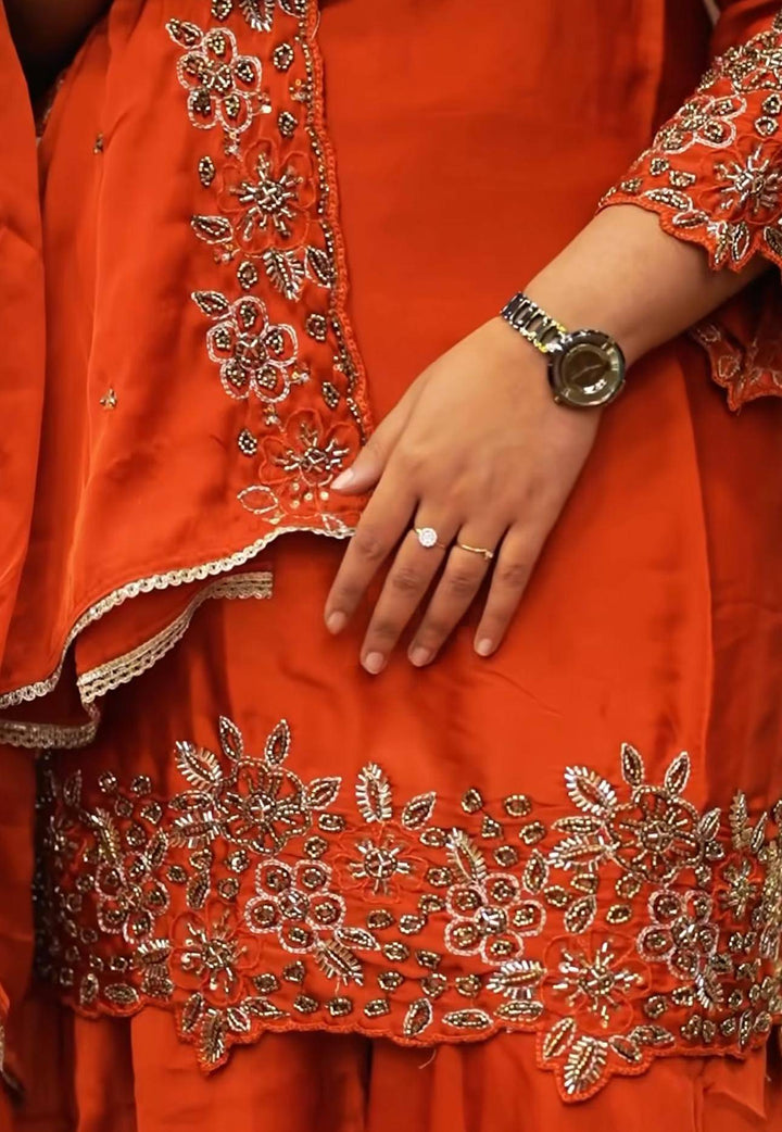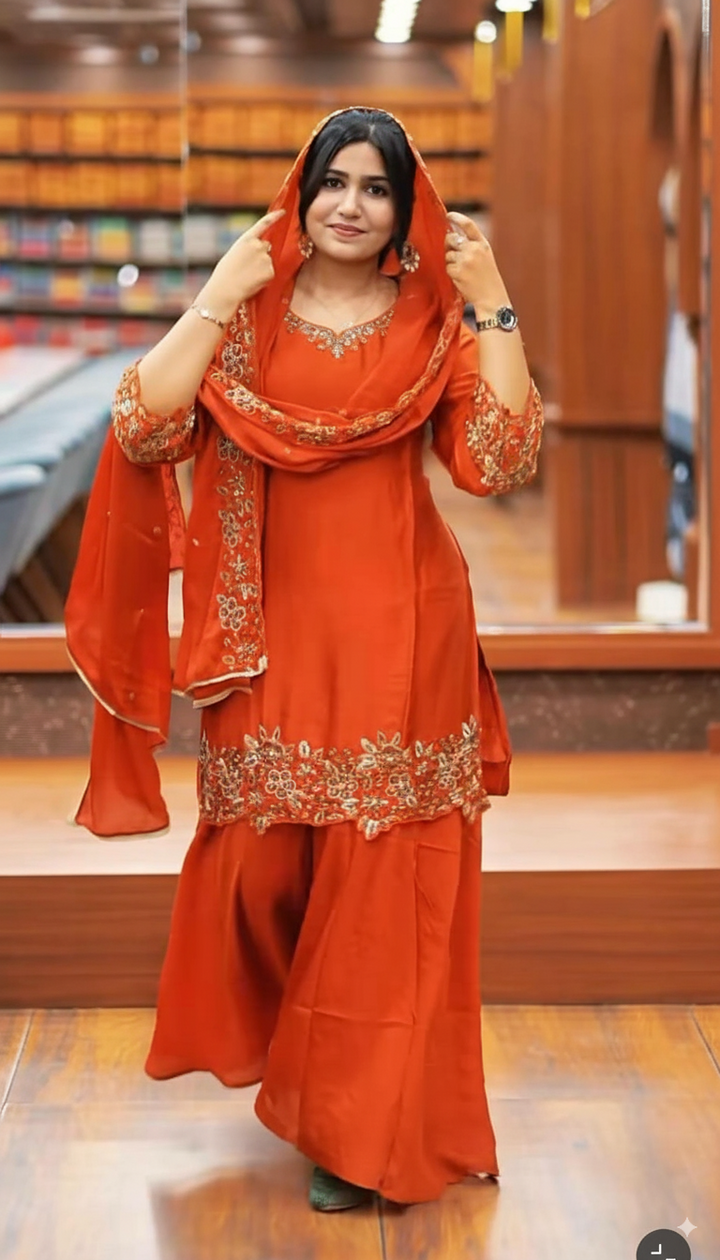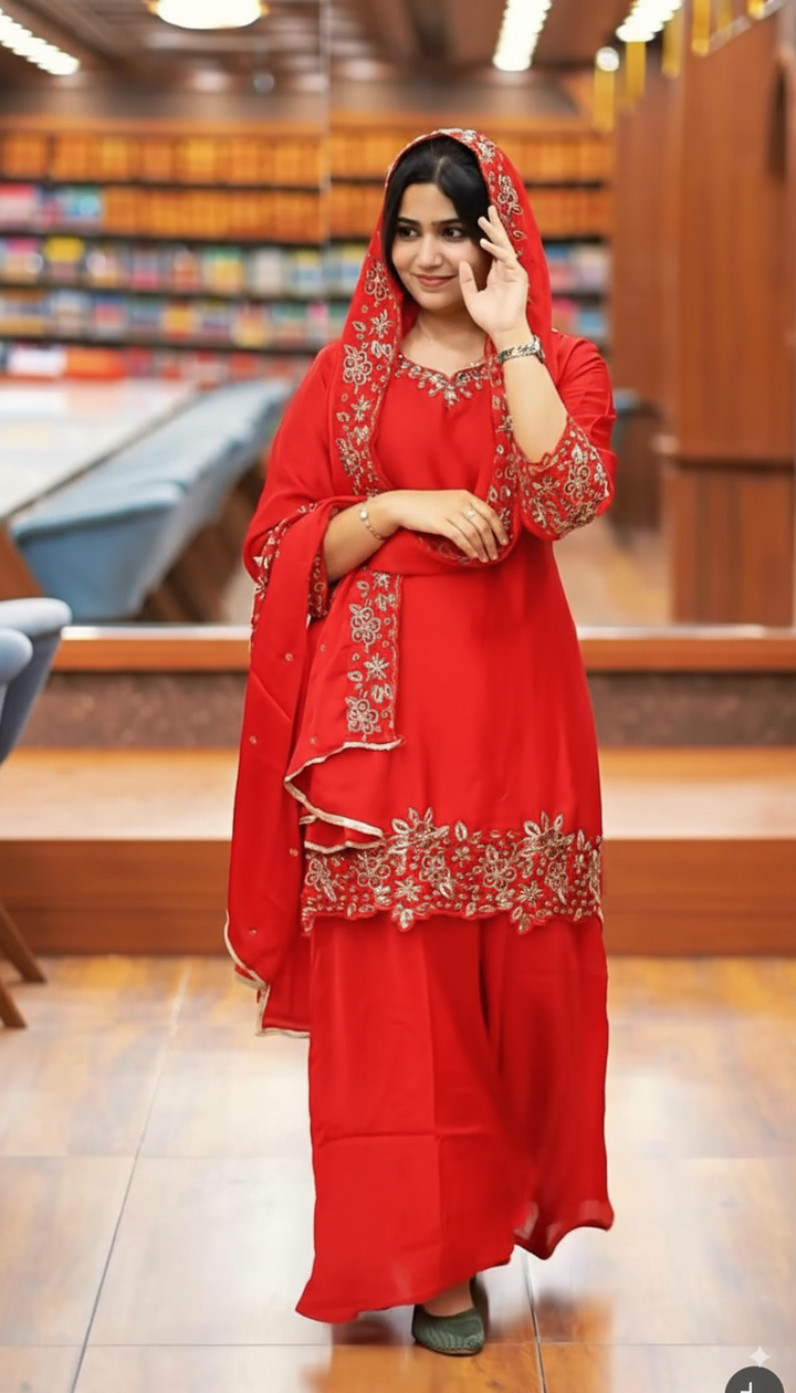Step out in radiant style with this stunning red embroidered sharara suit! Perfect for festive occasions and celebrations, this elegant ensemble features a beautifully embroidered kurta with intricate detailing on the neckline, sleeves, and hem. The matching wide-legged sharara pants offer a comfortable yet fashionable silhouette, complemented by a coordinating dupatta adorned with delicate embroidery. Crafted for grace and glamour, this sharara suit is designed to make you shine